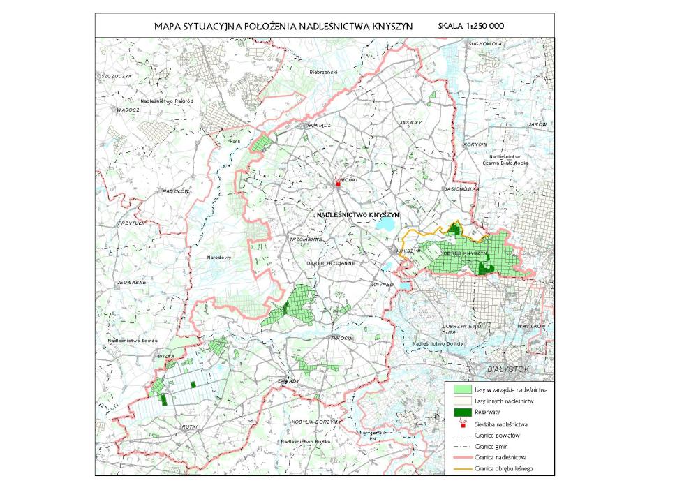 Nadleśnictwo Knyszyn położone jest na terenie województwa podlaskiego w powiatach: białostockim (gminy: Czarna Białostocka, Dobrzyniewo Duże, Tykocin-miasto, Tykocin, Zawady), monieckim (gminy: Goniądz, Jasionówka, Jaświły, Knyszyn-miasto, Knyszyn, Krypno, Mońki-miasto, Mońki, Trzcianne) i zambrowskim (gmina Rutki). W skład nadleśnictwa wchodzą obręby leśne: Knyszyn i Trzcianne. Podzielone jest ono na 12 leśnictw.
